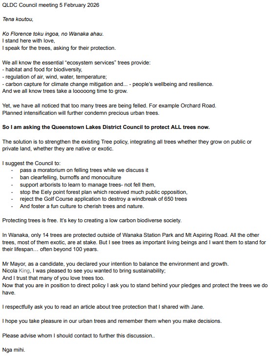 My intention is to gather feedback and revise the text accordingly, then go to a QLDC public meeting and submit the request to the Mayor with all the support received.